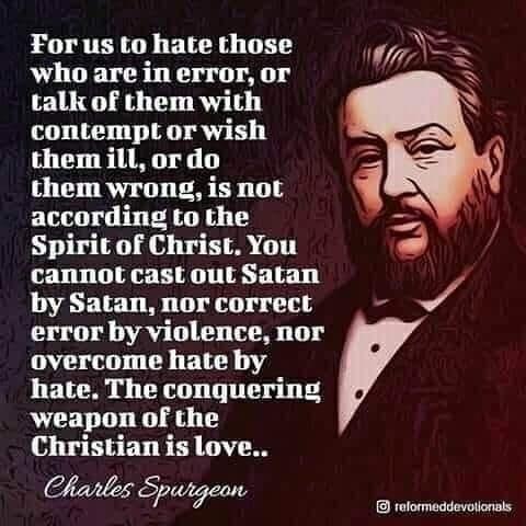 [Texto de la imagen: «Que odiemos a los que están en el error, o hablemos de ellos con desprecio o les deseemos el mal, o les hagamos mal, no es conforme al Espíritu de Cristo. No se puede expulsar a Satanás usando a Satanás, ni corregir el error con violencia, ni vencer el odio con odio. El arma vencedora del cristiano es el amor…» . Charles Spurgeon]