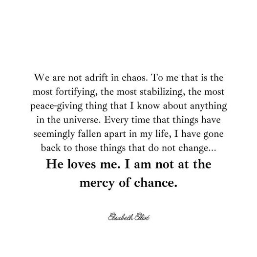 No estamos a la deriva en el caos. Para mí eso es lo más fortificante, lo más estabilizador, lo que más paz me da de todo lo que conozco en el universo. Cada vez que las cosas han parecido desmoronarse en mi vida, he vuelto a esas cosas que no cambian… Él me ama. No estoy a merced del azar. – Elisabeth Elliot]