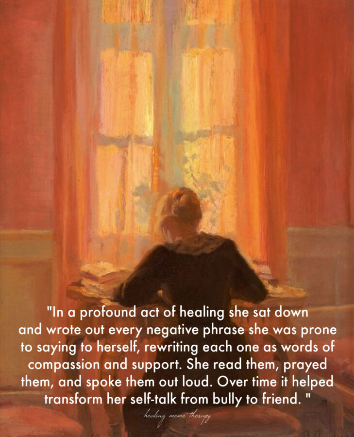 [Texto de la imagen: “En un profundo acto de sanación se sentó y escribió cada frase negativa que era propensa a decirse a sí misma, reescribiendo cada una como palabras de compasión y apoyo. Las leyó, las oró y las pronunció en voz alta. Con el tiempo, le ayudaron a transformar su conversación mental de acosadora en amiga”.]
